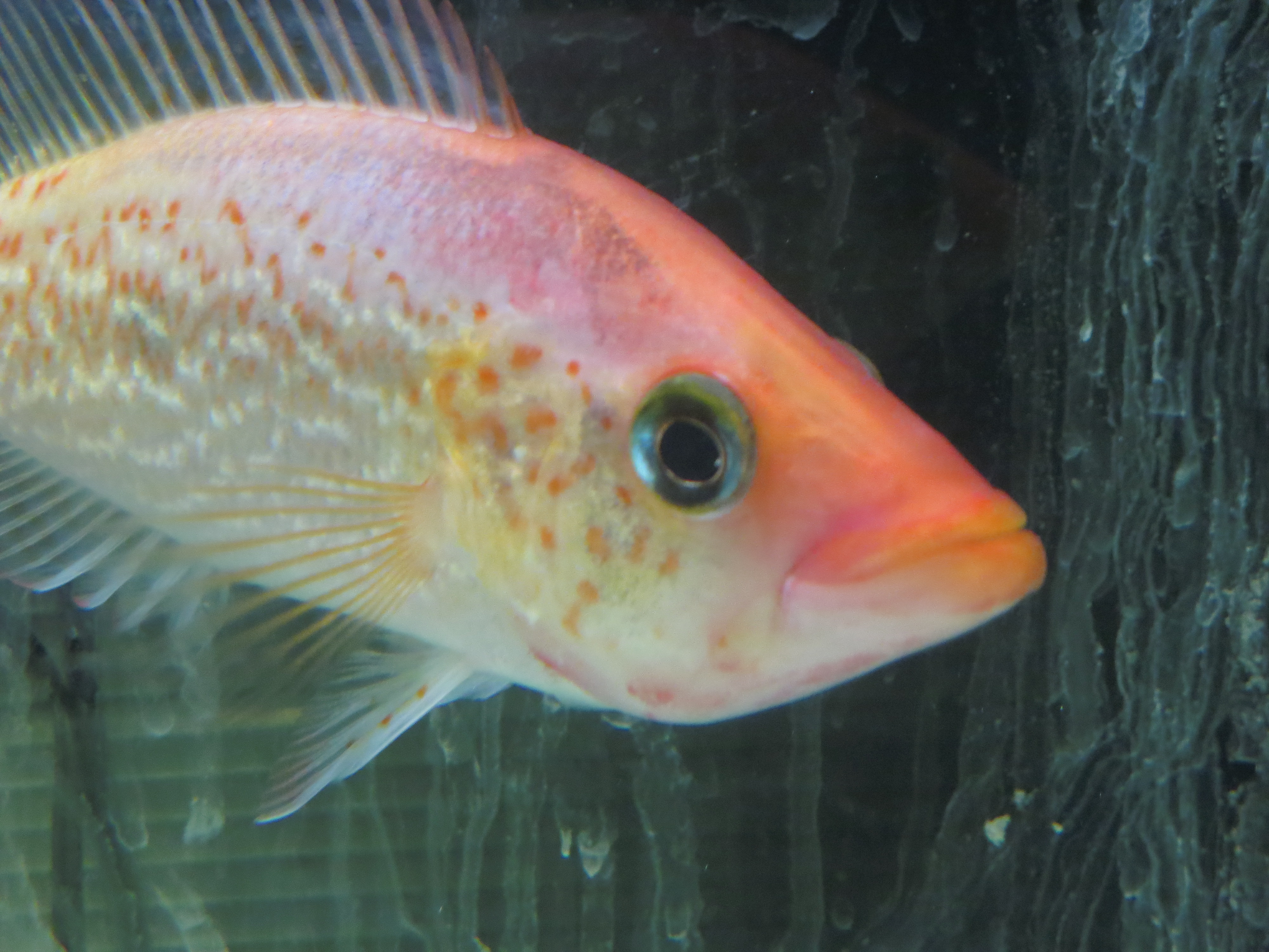 | 混泳での注意点 | 気性:攻撃的になることがある。シクリッドにしては大人しい方。同じ程度の大きさの魚なら混泳が可能。しかしテリトリーを主張できるだけの遊泳スペースがあると途端に攻撃的になることがある。また、その大きな口に入る魚は全て食べられてしまう。自分と同じ体高の魚なら食べようとするので注意が必要。 | |