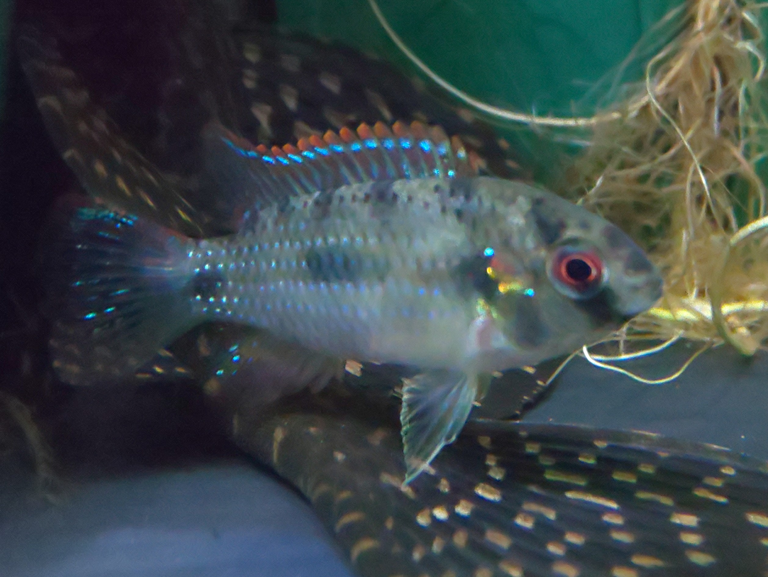 虹色のエラブタ、赤い目、オレンジとブルーの背びれと、小型ながら熱帯魚らしい鮮やかな色彩を楽しめる人気のシクリッド。飼いこむと、青いスポットが鮮やかに出る。
