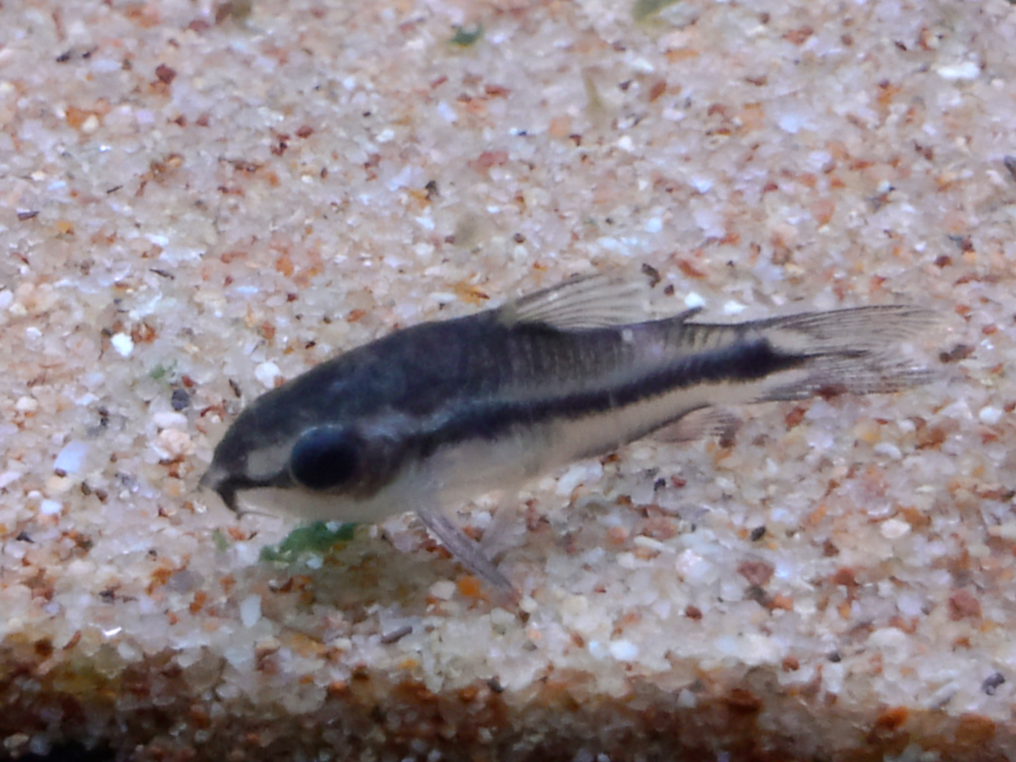 別命コリドラス・ピグミーという名前が示す通り最も小型なコリドラスだ。体形もコリドラス・エレガンス体形を通り越し、さらにスマートだ。それでもコリドラスということを主張するように、ちょこっと生えるヒゲが可愛らしい。遊泳力は高いが、臆病な面を持つため、元気に泳ぎ回る姿を見たいなら、ある程度まとまった数で飼育する必要がある。