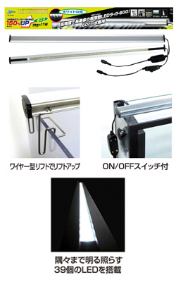 - LEDチップ39個を配列した超薄型・高輝度・長寿命な60㎝水槽用薄型LEDライト。