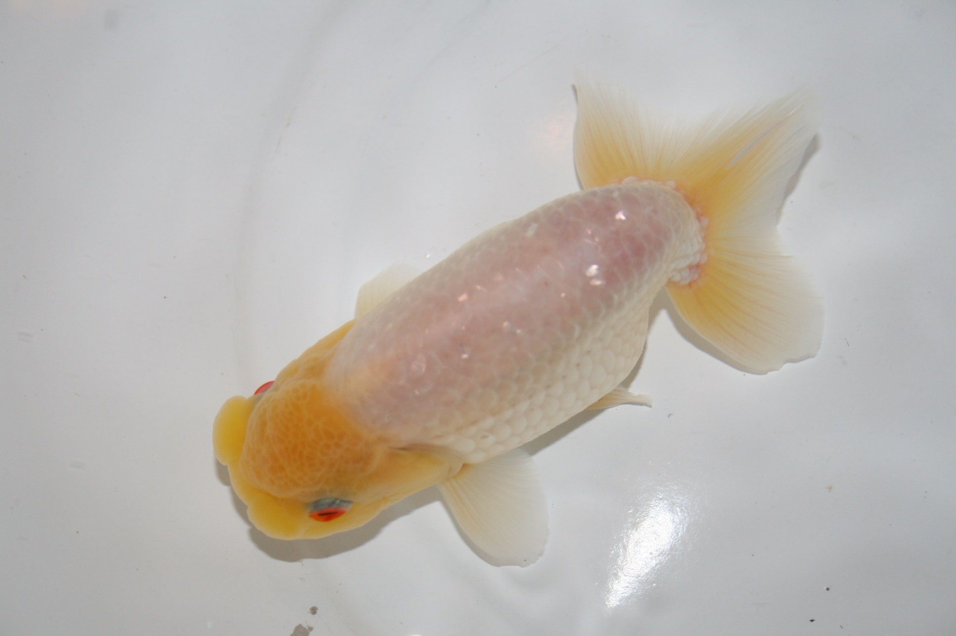 写真提供:吉田観賞魚販売 白いランチュウは品評会では好まれません。