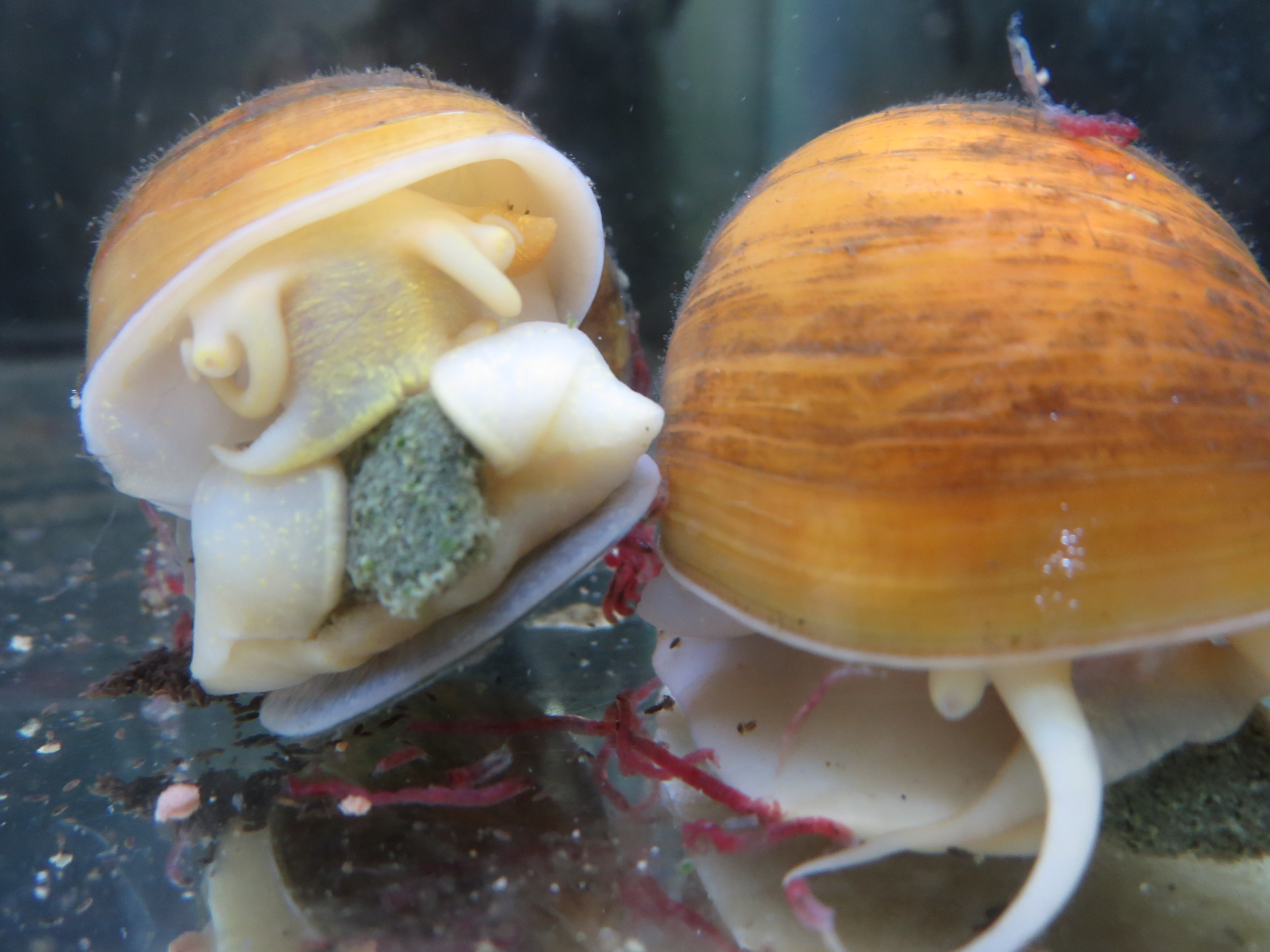 写真提供:吉田観賞魚販売 エサをだれにも渡したくない、ゴールデンアップルスネール[編集]