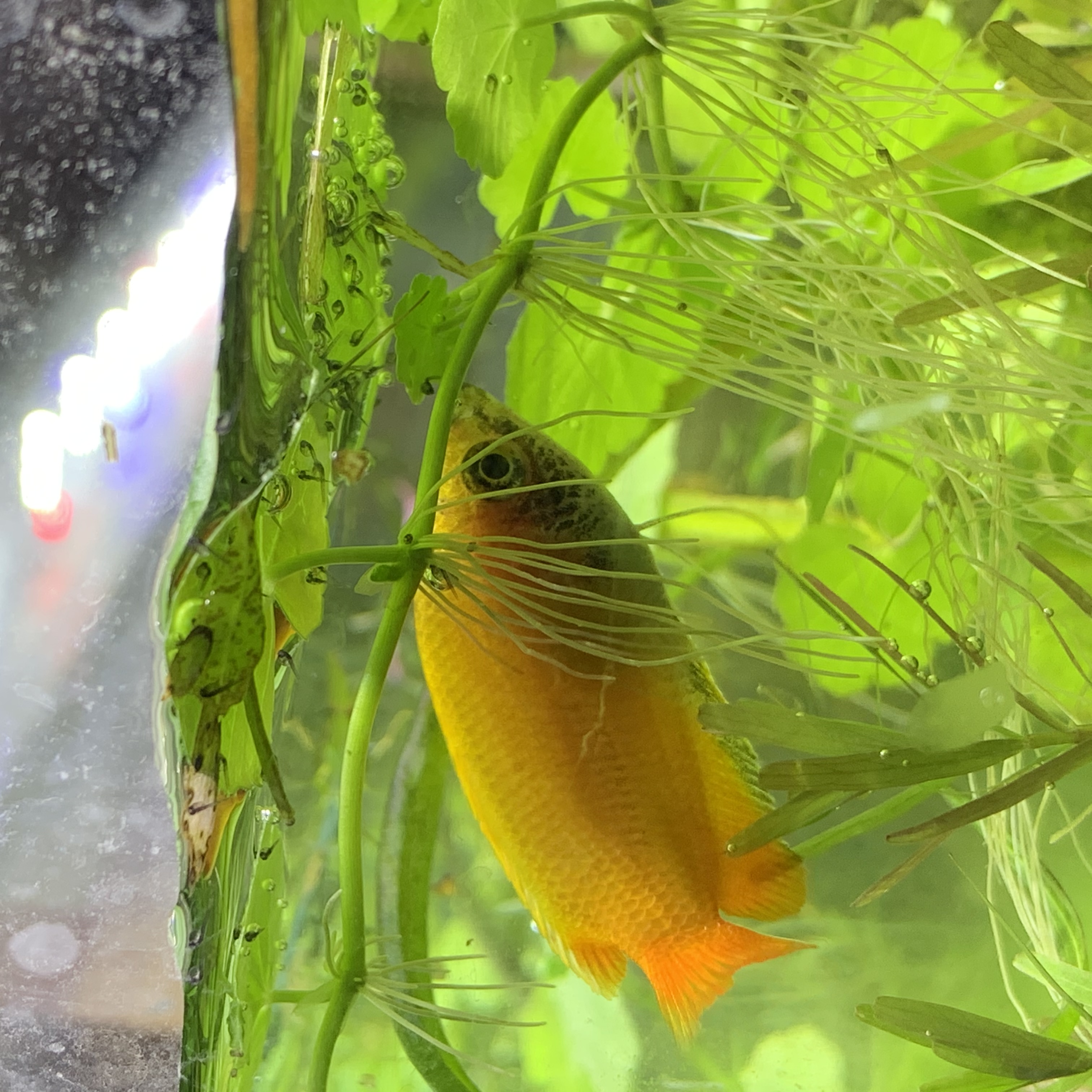 繁殖はそれほど難しくないが、いくつかポイントがある。まずバブルネストビルダー?なので安心して卵が埋めそうな場所を作る必要がある。水面まで達する水草や、浮き草があるといいだろう。