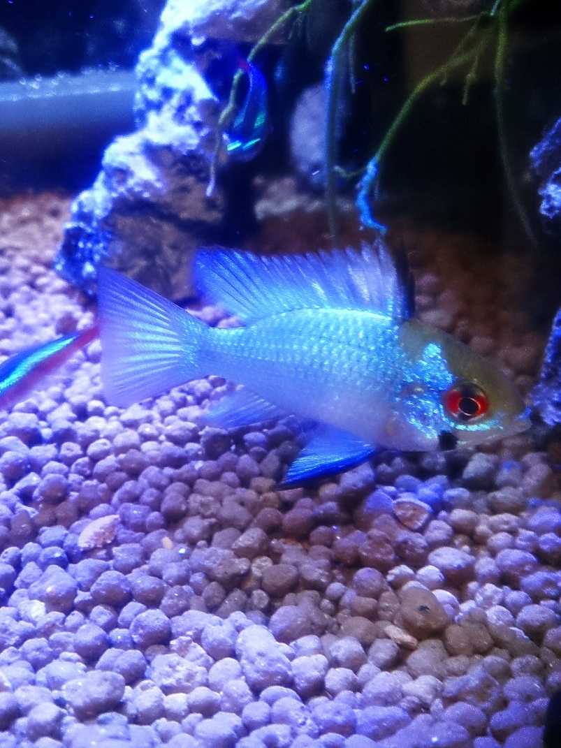 原種のラミレジィよりはおとなしい。グッピーやカージナルを追い払うけど、深追いはしないです。コリドラスなどにもちょっかいを出すけど、時間が経つとあんまり危害を加えなくなりました。