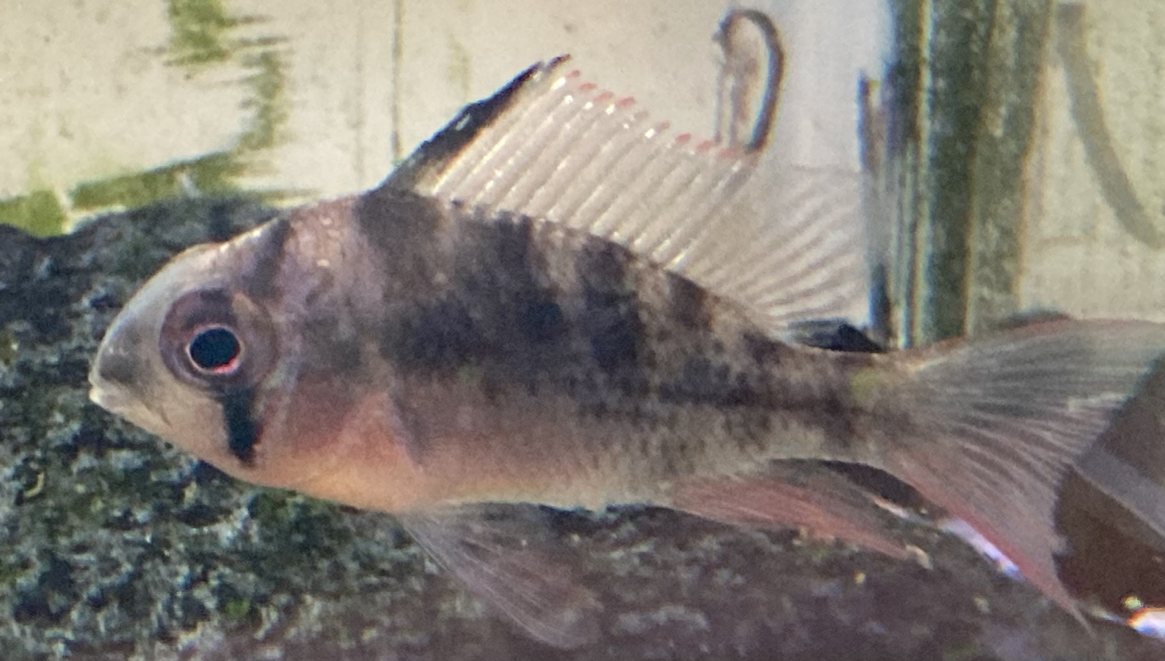 環境に慣れれば、飼育者に反応し餌を求めて水面まで来ますが、基本的には流木の影などの低層及び中層で活動しています。