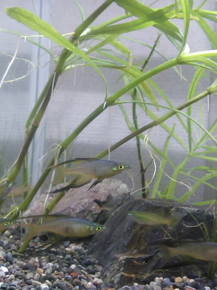 90×45×45水槽。個体25匹、混泳ネオンテトラ30匹、クーリーローチ10匹。半分は背面喫水線までの岩組と左半分が水草の水槽に混泳中、しきりにフィンダンスをしている、雌雄の判別は困難。見ているだけで楽しくなる。クーリーローチもお腹がすくと岩の隙間から顔を出して餌を探している。お互いに干渉しなくて安心できる。(名無しさん 2017-06-30 (金) 15:36:48)