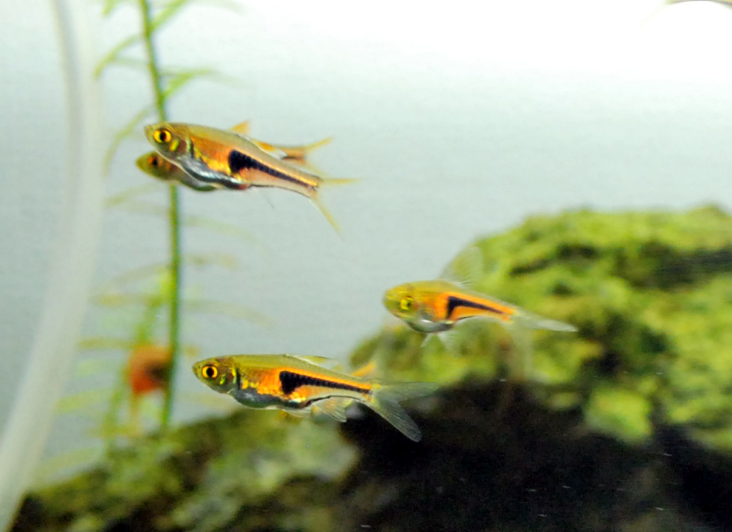 ラスボラ・ヘテロモルファと比べると体高が低く三角形も細長く、オレンジがさらに鮮やかなのが特徴だ。