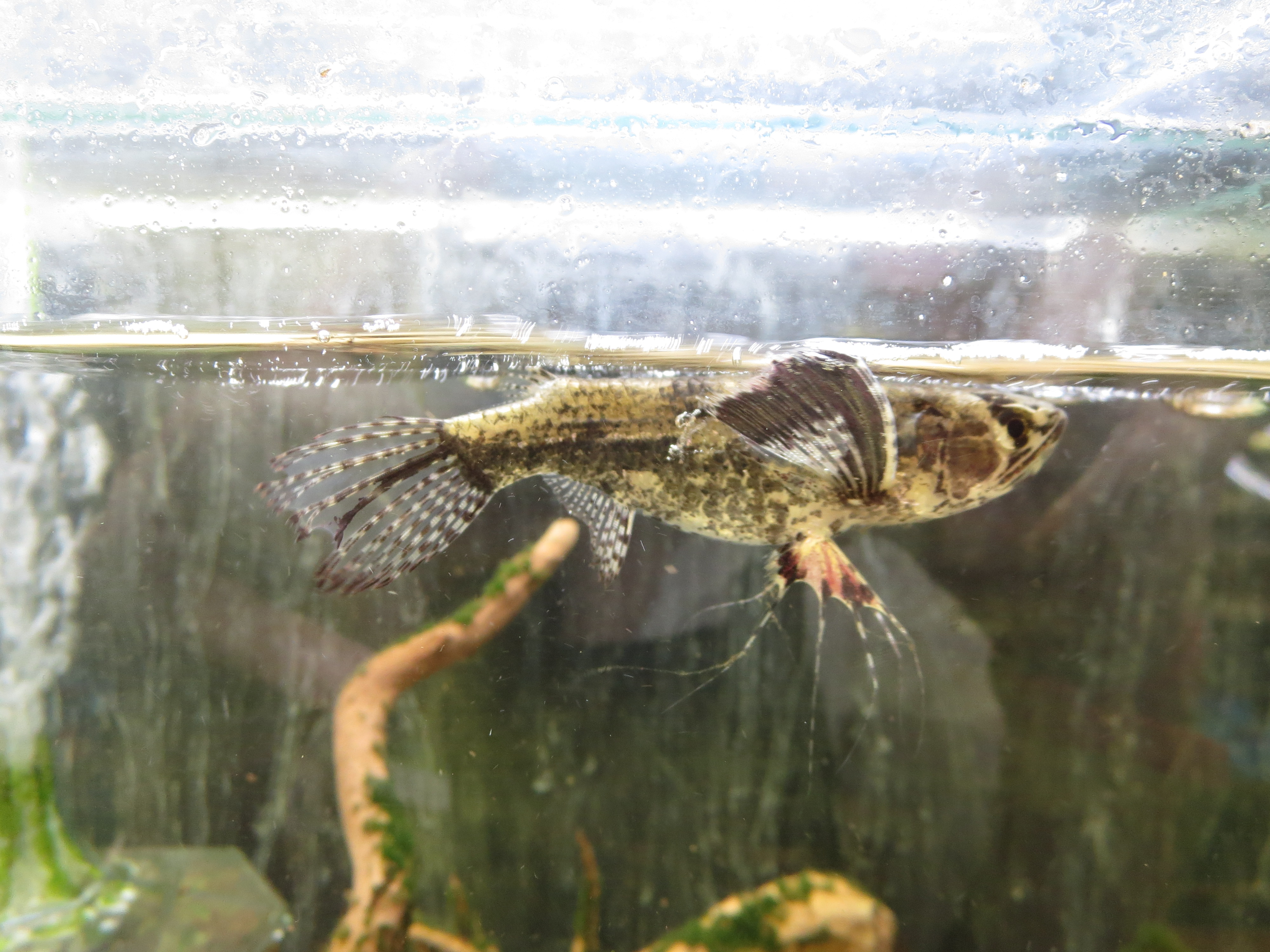 小型ながらアロワナ目の古代魚とあって野趣あふれる捕食シーンを見せてくれる。普段おとなしい彼らが活餌が水面に漂うさまを見た途端、飛びつくように餌を食べる様はそのまま生息域での生態を見るようだ。